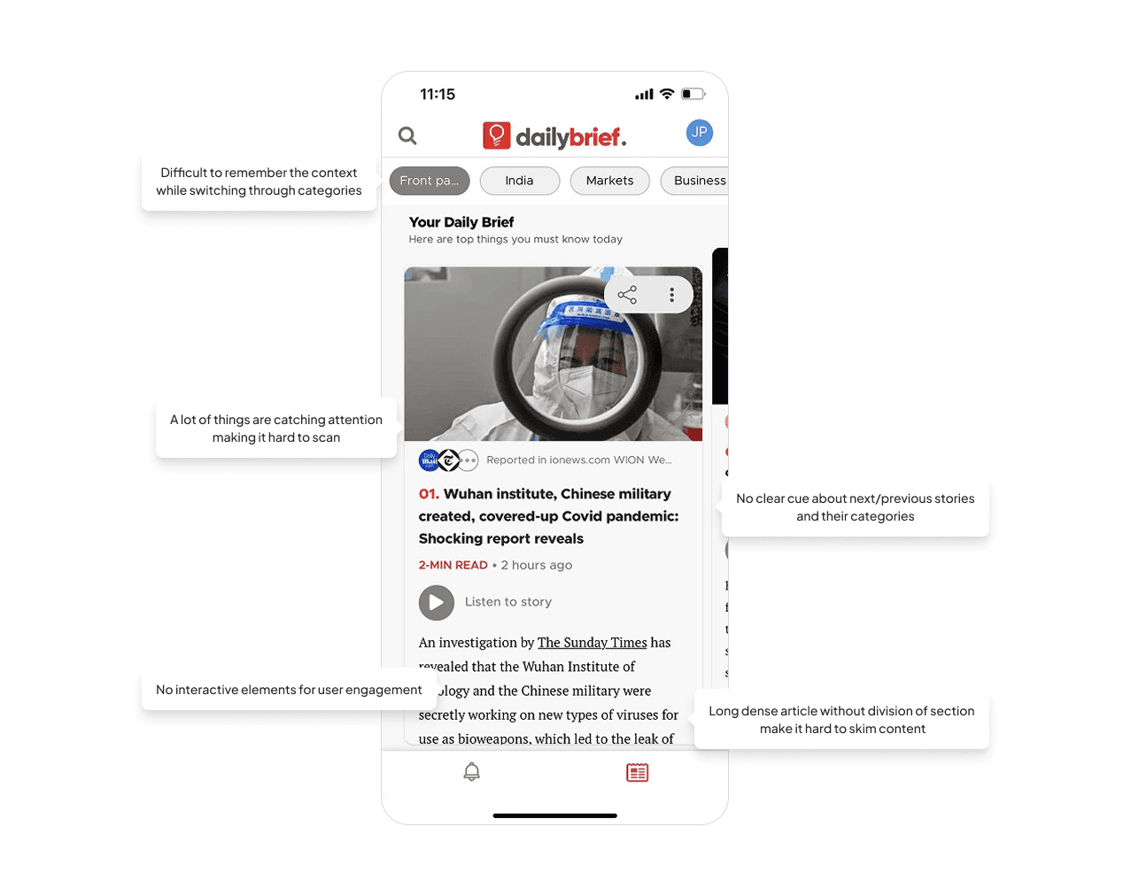 DailyBrief users mostly scrolled through long news and left without interacting. Important stories were hard to prioritized and no features for user interaction or to express opinions.