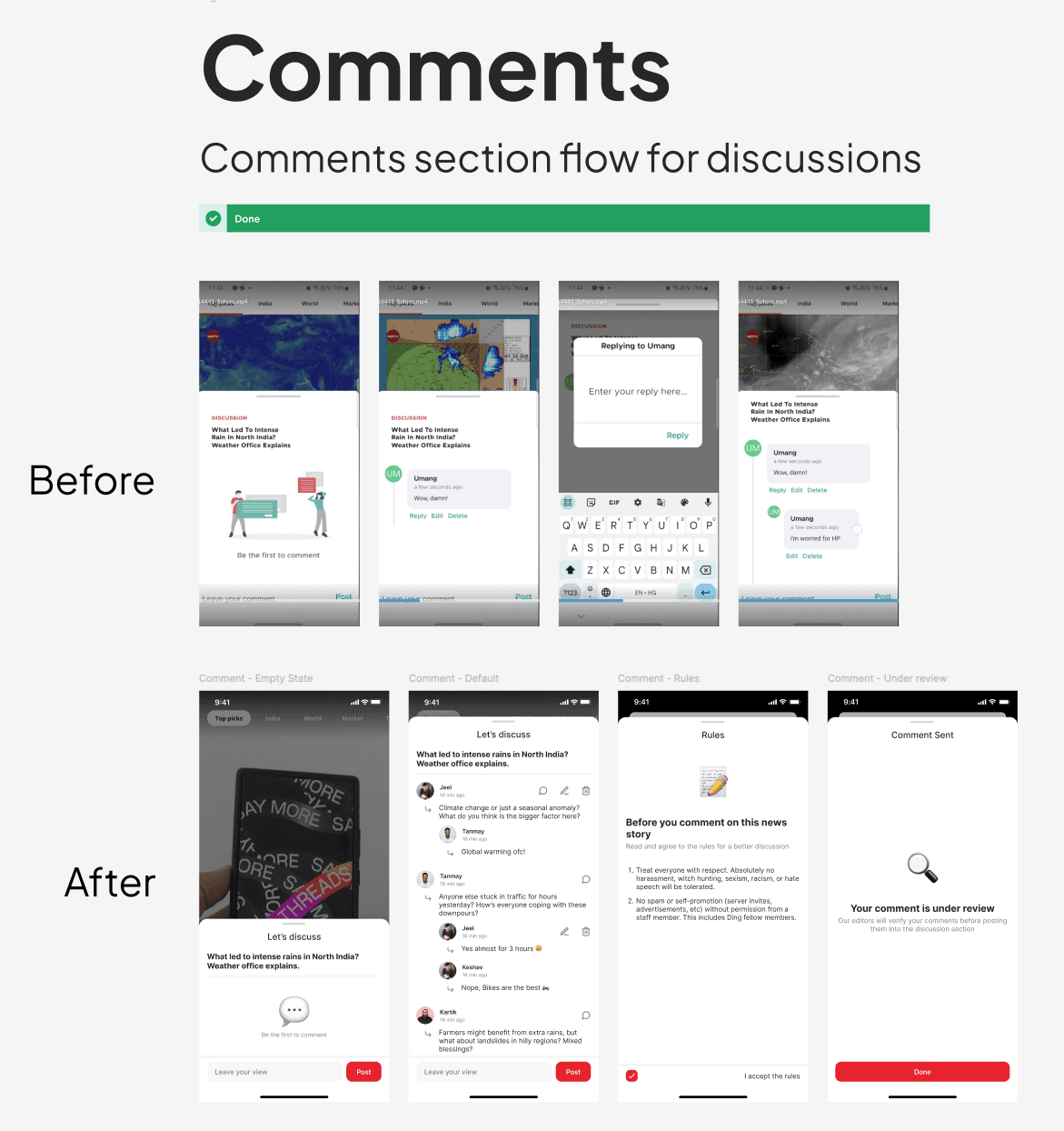 To support community interaction, we designed a full comments and moderation flow, including empty states, rules, and review statuses, ensuring psychological safety and transparency while encouraging healthy discussions.